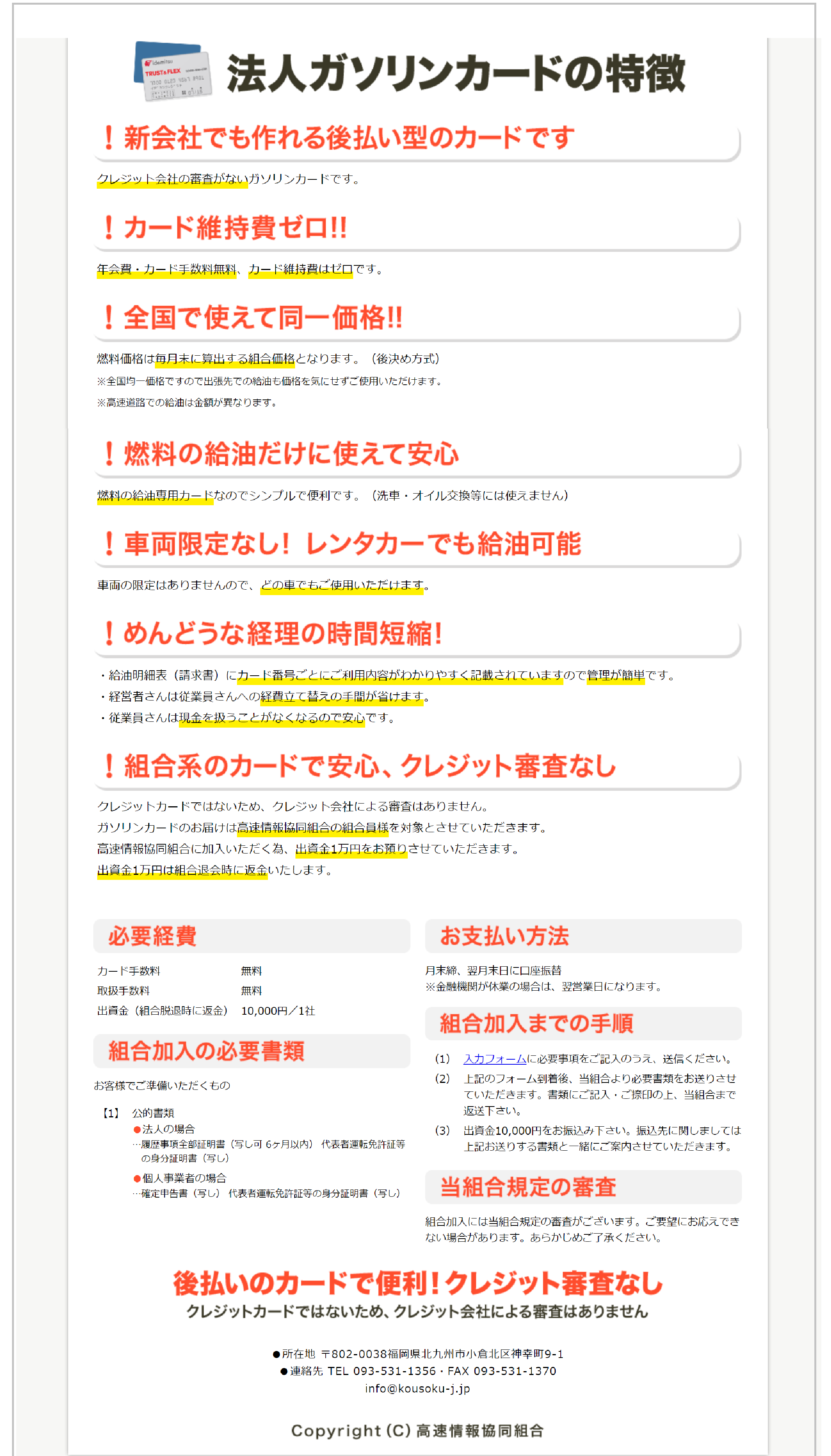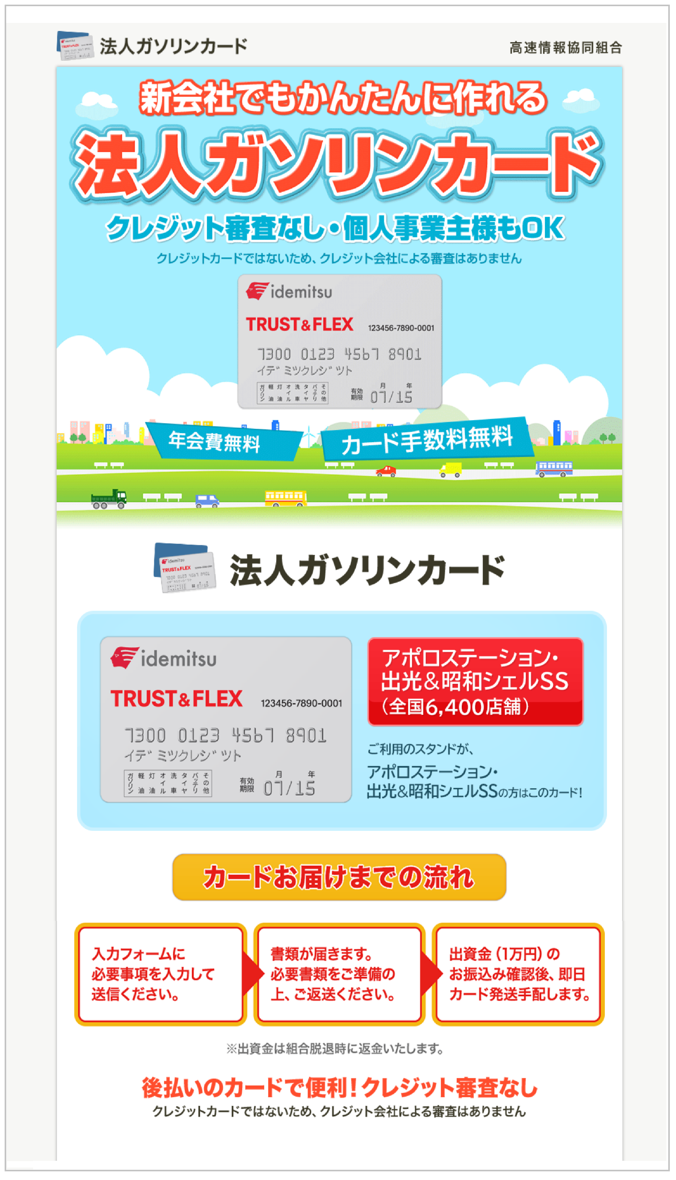 ※利用金額が大きいため、クレジット会社にとってもガソリンカードには慎重になるからです。 それを解決するのが高速情報協同組合のガソリンカードです。